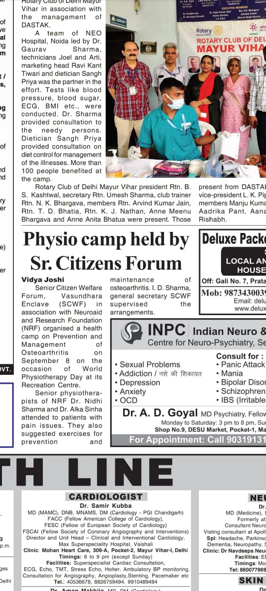 On the occasion of World Physiotherapy Day, Team NRF of Manav Ashray Physiotherapy Centre conducted a free medical camp on 8 September 2022 at the Senior Citizens’ Welfare Forum, Vasundhara Enclave on “Prevention and Management of Osteoarthritis” . The team included Dr Alka Sinha, Dr Nidhi Sharma and intern Ms Vaishali from the Amar Jyoti Institute of Physiotherapy.