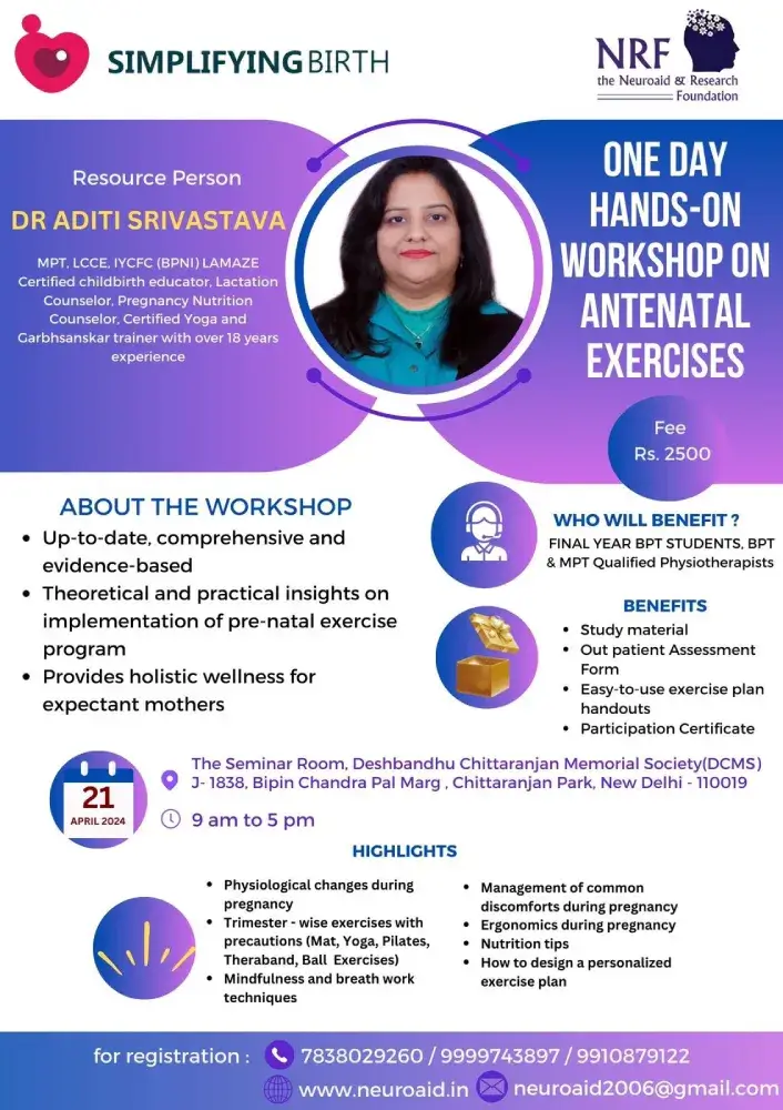 As part of NRF’s CPD initiative, a one-day hands-on Workshop on ‘Pre- Natal Exercises’ was organized at the Deshbandhu Chittaranjan Memorial Society (DCMS) premises on 21st April 2024.