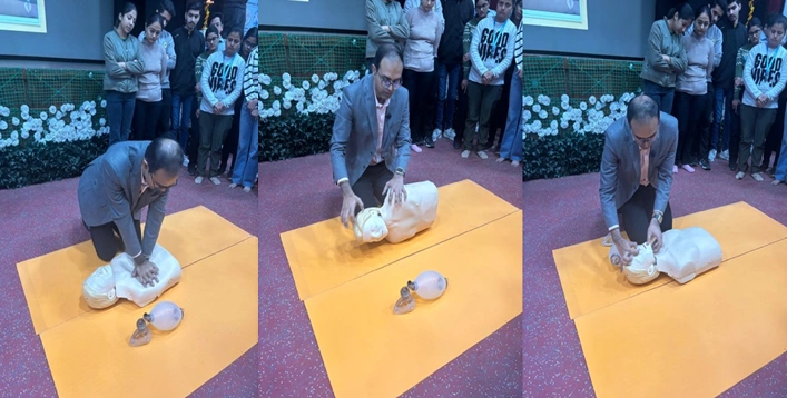 After introducing the participants to the basic knowledge and importance of Basic Life Support (BLS), Dr. Rupam Sadhukhan demonstrated the practical component using a mannequin. He explained the primary phases of BLS, which include: