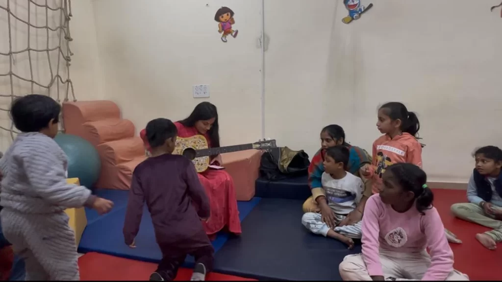 After a short break, the excitement continued with a lively music jamming session. A special medley of children’s rhymes was prepared by the Aadyantara team. Volunteers led the session with energy and warmth, instantly capturing the children’s attention. Music—being a favourite among our kids—sparked joy and participation. Following the group jamming, the children had the opportunity to play the guitar, guided by volunteer, and sing their favourite rhymes.