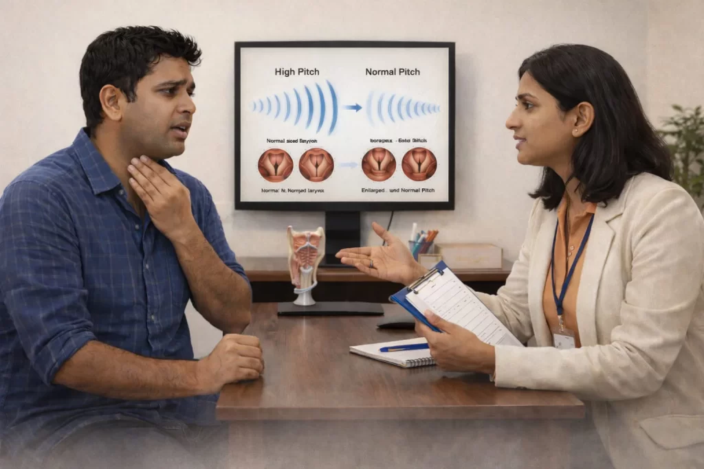 Although structural abnormalities are usually absent, delayed functional adaptation of the larynx, habitual use of a high pitch, and psychological factors—such as anxiety, emotional stress, or difficulty accepting pubertal changes—are commonly implicated (1). The voice sounds high all the time, may crack in the middle of a sentence, lacks power or turns breathy plus tight. Once the pattern sets, it does not fade on its own. Beyond sound, the man often feels shame, avoids groups and fears speaking at work or school.
