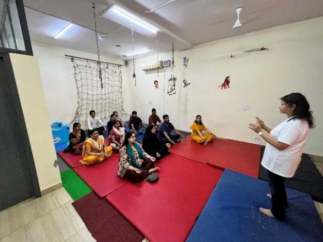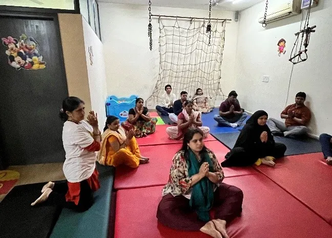 Following the enlightening discourse on Smile Mudras Meditation, the workshop transitioned into a hands-on training session, offering participants a practical experience of these transformative techniques. Attendees were guided through the intricate movements and gestures of Smile Mudras, enabling them to actively engage with the practice and witness its therapeutic effects first hand. Moreover, the significance of infusing smiles into every facet of a child’s environment was underscored, with innovative suggestions such as utilizing smiley balls, embellishing fruits with smiley faces, and employing smiley stickers to instil joy into daily routines. As parents delved deeper into the practical application of Smile Mudras and meditation, they posed queries and shared concerns regarding their incorporation with children. Meaningful discussions ensued, addressing uncertainties and providing insights into effectively integrating these techniques into caregiving routines. Participants were encouraged to embrace the potency of positive affirmations through mantras such as “ma”, “la”, “ha”,and “aha,” fostering optimism and vitality in both caregivers and children alike. Through this experiential learning approach, attendees gained practical insights into incorporating Smile Mudras Meditation into their daily lives, thereby nurturing an environment conducive to holistic healing and well-being, and comprehended how these techniques can positively impact the well-being of their children as well.