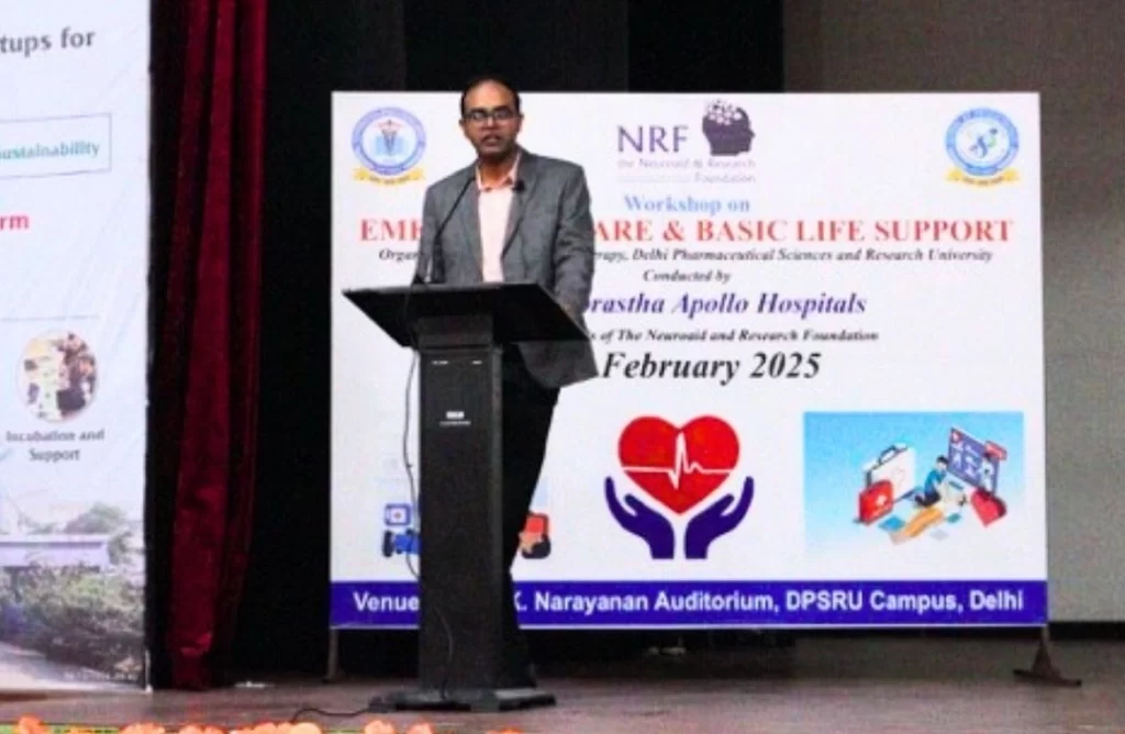 The Delhi Pharmaceutical Sciences and Research University (DPSRU) organized a workshop on “Emergency Care & Basic Life Support” on 14th February 2025, in collaboration with Indraprastha Apollo Hospitals and under the aegis of The Neuroaid & Research Foundation (NRF).