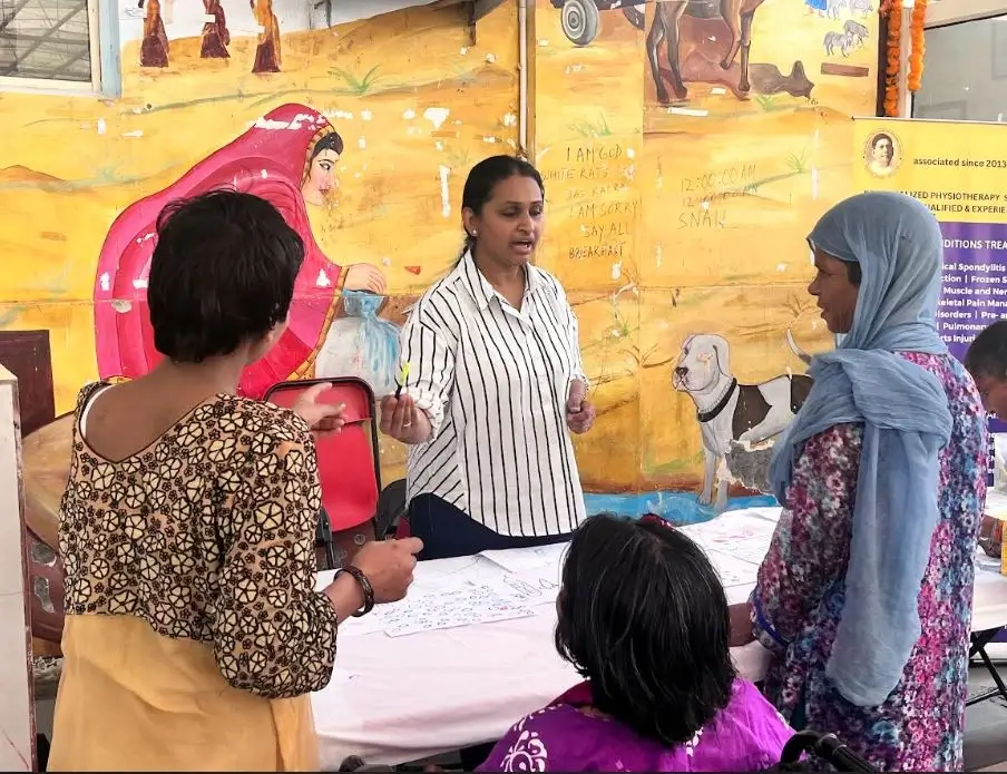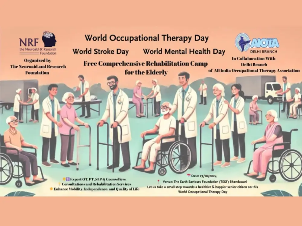 NRF initiated its collaboration with The Earth Saviours Foundation (TESF) by conducting a multidisciplinary rehabilitation camp on 27 October 2024 at Bandhwari Village, Faridabad. The camp was held to commemorate three important events : viz., World Mental Health Day (10 Oct), World Occupational Therapy Day (27 Oct) and International Stroke Day (29 Oct). Another highlight of the camp was that for the first time, NRF requested and was granted permission to use the logo of All India Occupational Therapy Association (AIOTA) : this further validated and endorsed NRF’s camp activities. The multidisciplinary team comprised of two Occupational Therapists, two Physiotherapists, a Speech Therapist, Psychologist and Child Guidance Counsellor, besides a Professional Expressive Arts Therapist and two student volunteers.